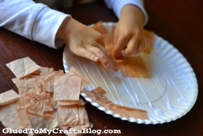 - Have your child cover it with the tan tissue paper squares, until the paper plate is completely covered.